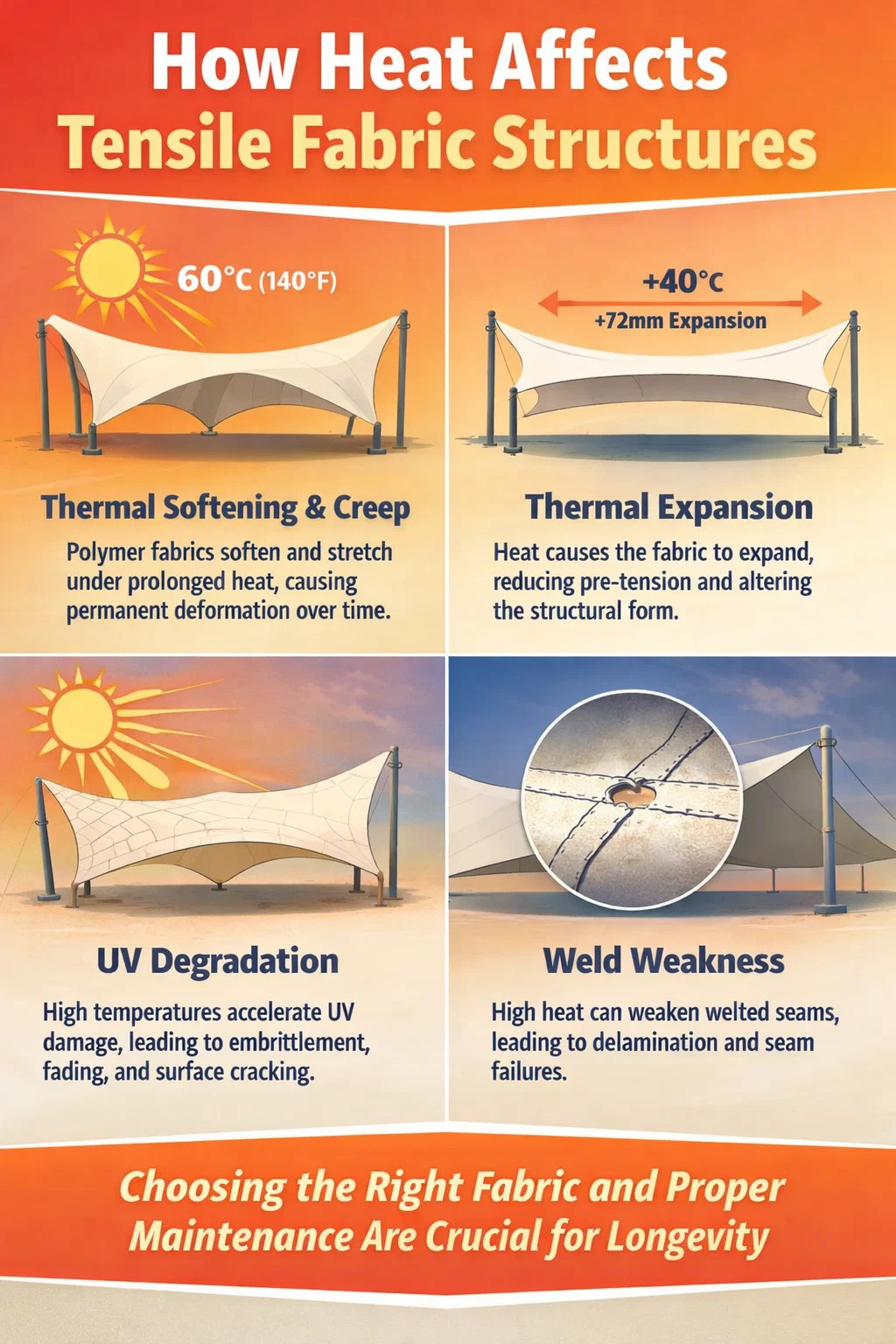 Gerilebilir kumaş yapıları, formlarını korumak, suyu doğru bir şekilde boşaltmak ve rüzgarın yükselmesine direnmek için hassas şekilde kalibre edilmiş ön gerilime bağlıdır. Isı kumaşın genleşmesine neden olur; soğuması büzülmesine neden olur. PVC çekme kumaşının termal genleşme katsayısı yaklaşık olarak Santigrat derece başına metre başına 0,18 mm . 10 metrelik bir aralıkta, sıcak bir iklimde gece ile öğlen arasında tipik olarak görülen 40°C'lik bir sıcaklık değişimi, kabaca 72 mm boyutsal değişime neden olur. Yapı mühendisleri kenar kablolarını, köşe bağlantılarını ve gerdirme donanımını boyutlandırırken bunu dikkate alır, ancak yetersiz spesifikasyon yazın sarkmaya ve kışın aşırı gerilmeye yol açarak her ikisi de kumaş ömrünü kısaltır.