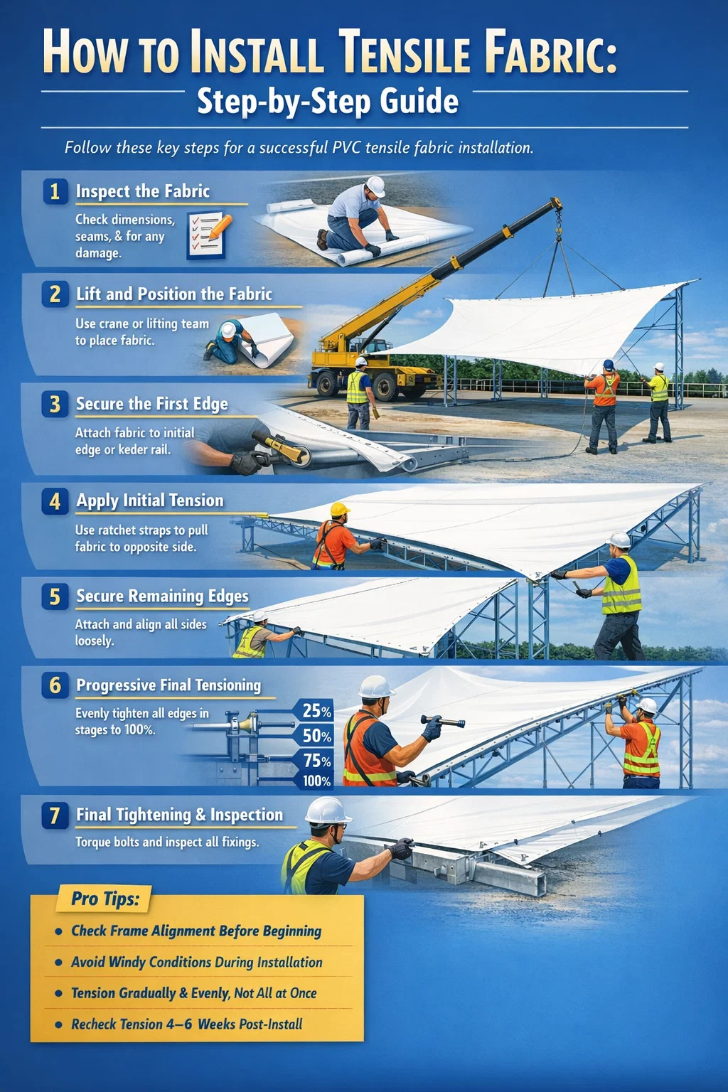 Aşağıdaki sıra çoğu ticari ve mimari PVC gerilebilir kumaş kurulumu için geçerlidir. Kullanılan özel kenar bağlantı sistemine (keder rayı, plaka kelepçesi veya kanal içi halat) göre ayarlayın.