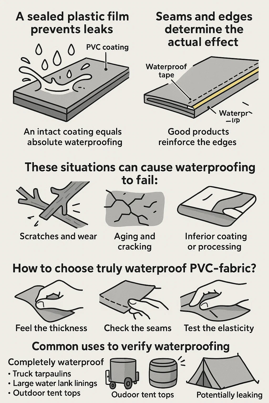 İyi ürünler kenarları güçlendirir: Yüksek kalite PVC kaplı kumaş Sızıntıları kapatmak için dikişleri (bir kamyon brandasının dikişleri gibi) kapatmak için ısıyla kapatılmış kenarlar veya su geçirmez bant kullanır.