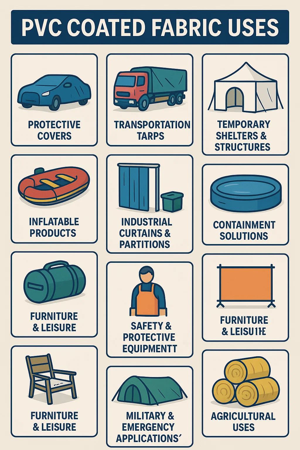 Burada yaygın kullanımların bir dökümü verilmiştir: PVC kaplı kumaş pratik uygulamalarını yansıtan: